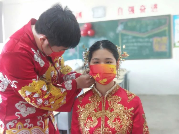 新郎田正波细数校长和老师们对他们的帮助:结婚当天穿的礼服是校长为他们张罗来的;新娘的头饰和他们戴的红口罩是别的老师拿来的;婚礼“会场”是同事们在休息时间帮忙布置的……田正波说,自己和妻子很感动也很感激。 新娘贾璐歌说,在自己工作的地方结婚,感到特别有意义。