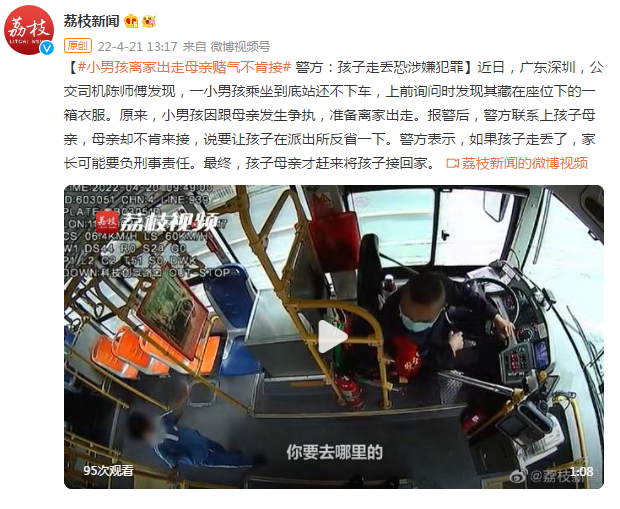 近日,广东深圳,公交司机陈师傅发现,一小男孩乘坐到底站还不下车,上前询问时发现其藏在座位下的一箱衣服。原来,小男孩因跟母亲发生争执,准备离家出走。报警后,警方联系上孩子母亲,母亲却不肯来接,说要让孩子在派出所反省一下。警方表示,如果孩子走丢了,家长可能要负刑事责任。最终,孩子母亲才赶来将孩子接回家。