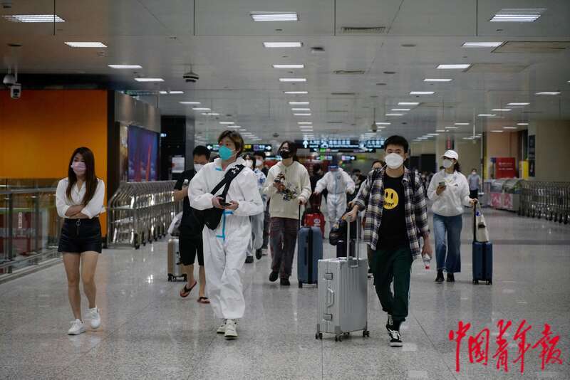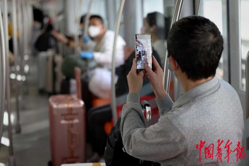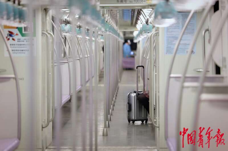 5月22日早上不到7点,中青报·中青网记者在上海地铁3号线虹口足球场站看到,地铁站尚未开门时,一名乘客就已到达地铁站入口处等待。她告诉记者,她准备乘坐地铁前往虹桥火车站,接着搭乘高铁前往南京,再转站回安徽老家。原本她打算骑自行车前往高铁站,后听闻地铁将于5月22日复运,便购买了地铁复运当天的离沪车票。记者在地铁3号线、10号线注意到,车厢内的乘客大多数都带着行李箱,准备前往虹桥火车站乘火车离开上海。