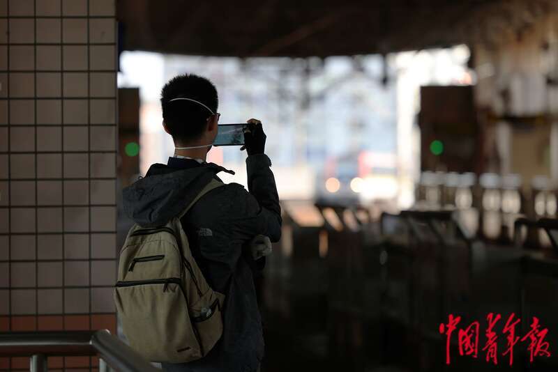 5月22日,上海地铁虹口足球场站,一名乘客举起手机拍摄地铁进站,这列地铁是上海地铁复运后3号线上的首班车。中青报·中青网记者 李强/摄