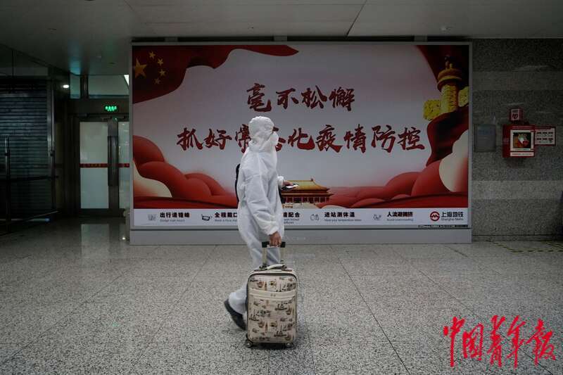 5月22日,上海地铁虹桥火车站站,一名身穿防护服的乘客刚刚抵达,他是当天第三波乘坐地铁抵达虹桥火车站的乘客。他身旁的墙上张贴着抗疫宣传海报:毫不松懈,抓好常态化疫情防控。中青报·中青网记者 李强/摄