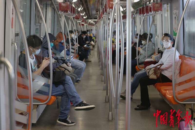 5月22日,上海地铁3号线,上海地铁公司的工作人员乘坐3号线首班车,随车查看复运首日乘车情况。中青报·中青网记者 李强/摄