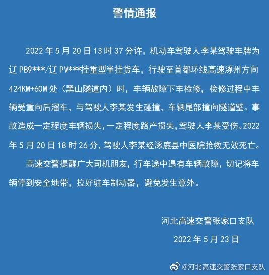 2022年5月20日13时37分许,机动车驾驶人李某驾驶车牌为辽PB9***/辽PV***挂重型半挂货车,行驶至首都环线高速涿州方向424KM+60M处(黑山隧道内)时,车辆故障下车检修,检修过程中车辆受重向后溜车,与驾驶人李某发生碰撞,车辆尾部撞向隧道壁。事故造成一定程度车辆损失,一定程度路产损失,驾驶人李某受伤。2022年5月20日18时26分,驾驶人李某经涿鹿县中医院抢救无效死亡。