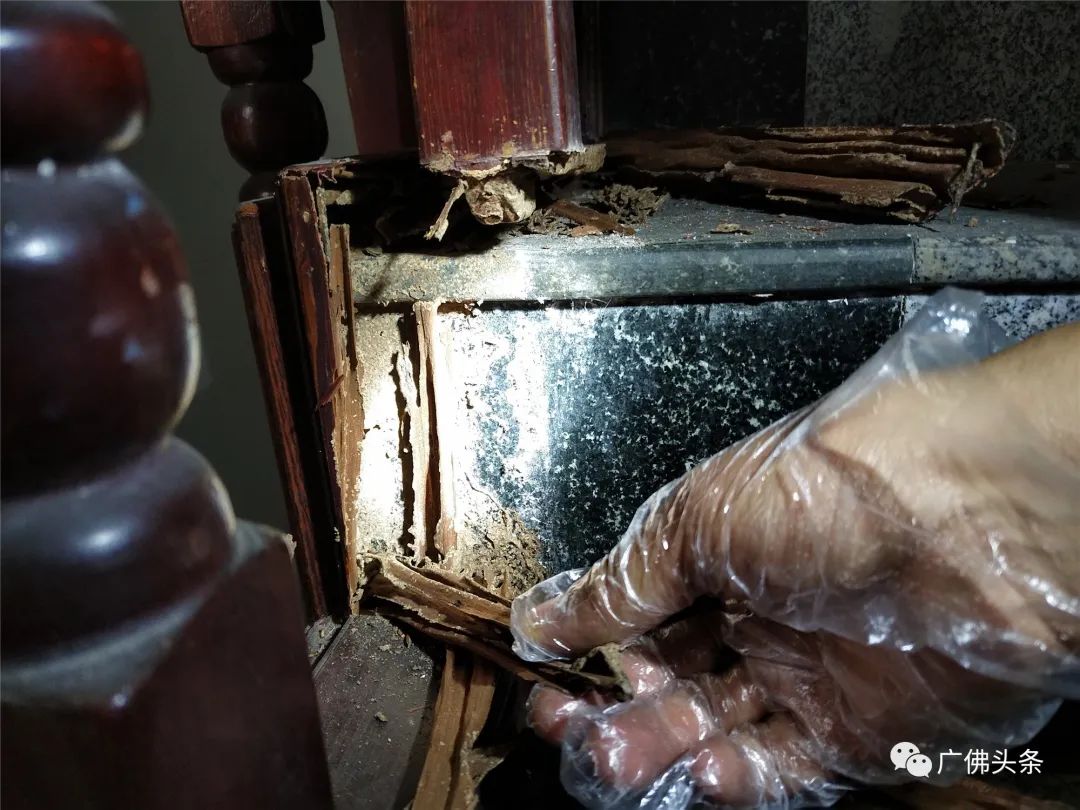 最近,郭老伯找来专业白蚁防治人员前往检查。经检查发现,郭老伯家中大量的木制家具基本都被白蚁侵蚀,包括木门、扶梯乃至天花板都有白蚁的踪迹,初步推测约有80万只白蚁 !广州日报全媒体记者接到市民报料后前往了解。