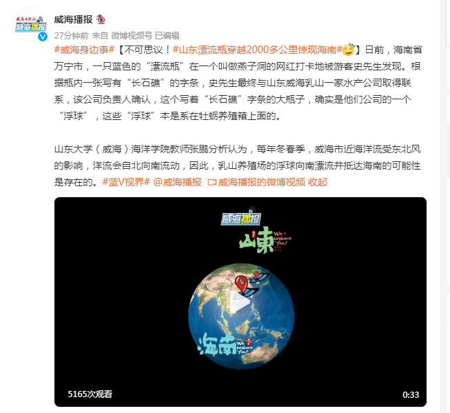 日前,海南省万宁市,一只蓝色的“漂流瓶”在一个叫做燕子洞的网红打卡地被游客史先生发现。根据瓶内一张写有“长石礁”的字条,史先生最终与山东威海乳山一家水产公司取得联系,该公司负责人确认,这个写着“长石礁”字条的大瓶子,确实是他们公司的一个“浮球”,这些“浮球”本是系在牡蛎养殖箱上面的。