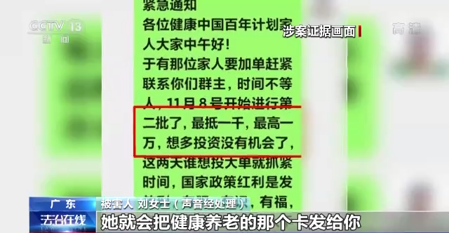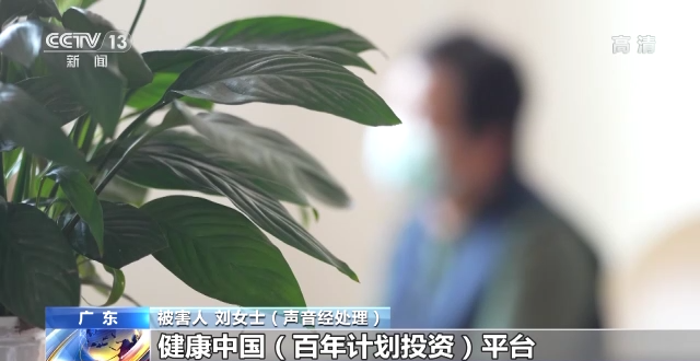 被害人 刘女士:他就这样说的,健康中国(百年计划投资平台),你投1000块钱。就变成一个会员,他就会把健康养老的那个卡发给你。到了想养老的时候,那个健康平台就会给你一个有优惠的养老政策。