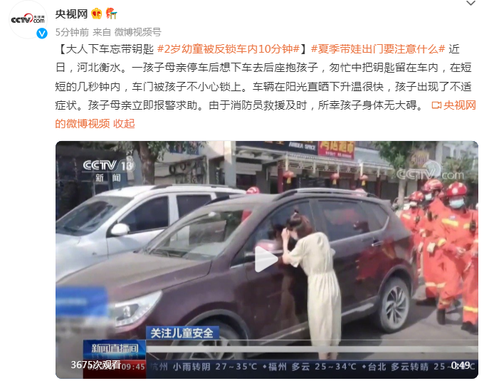 近日,河北衡水。一孩子母亲停车后想下车去后座抱孩子,匆忙中把钥匙留在车内,在短短的几秒钟内,车门被孩子不小心锁上。车辆在阳光直晒下升温很快,孩子出现了不适症状。孩子母亲立即报警求助。由于消防员救援及时,所幸孩子身体无大碍。