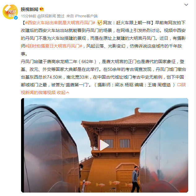 早前有网友拍下改建后的西安火车站出站就能看到丹凤门的场景,在网络上引发热烈讨论。视频中西安的丹凤门不是为火车站搭建的景观,而是在原址上复建的大明宫丹凤门。