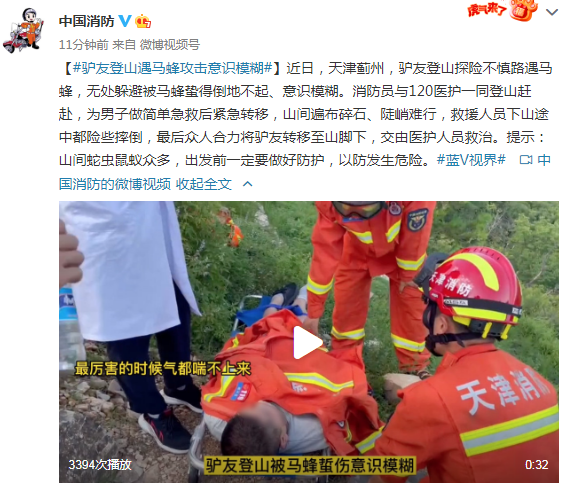 【#驴友登山遇马蜂攻击意识模糊#】近日,天津蓟州,驴友登山探险不慎路遇马蜂,无处躲避被马蜂蛰得倒地不起、意识模糊。消防员与120医护一同登山赶赴,为男子做简单急救后紧急转移,山间遍布碎石、陡峭难行,救援人员下山途中都险些摔倒,最后众人合力将驴友转移至山脚下,交由医护人员救治。提示:山间蛇虫鼠蚁众多,出发前一定要做好防护,以防发生危险。
