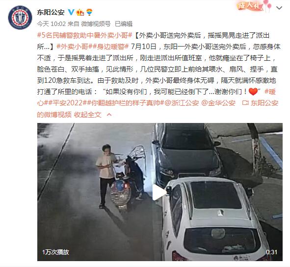 【外卖小哥送完外卖后,摇摇晃晃走进了派出所…】#外卖小哥##身边暖警# 7月10日,东阳一外卖小哥送完外卖后,忽感身体不适,于是摇晃着走进了派出所,刚走进派出所值班室,他就瘫坐在了椅子上,脸色苍白、双手抽搐,见此情形,几位民警立即上前给其喂水、扇风、捏手,直到120急救车到达。由于救助及时,外卖小哥最终身体无碍,隔天就满怀感激地打通了所里的电话:“如果没有你们,我可能已经倒下了…谢谢你们!