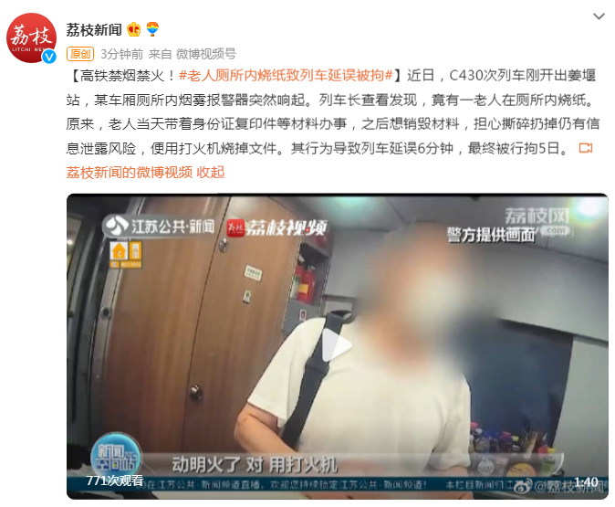 近日,C430次列车刚开出姜堰站,某车厢厕所内烟雾报警器突然响起。列车长查看发现,竟有一老人在厕所内烧纸。原来,老人当天带着身份证复印件等材料办事,之后想销毁材料,担心撕碎扔掉仍有信息泄露风险,便用打火机烧掉文件。其行为导致列车延误6分钟,最终被行拘5日。