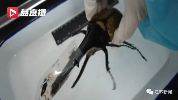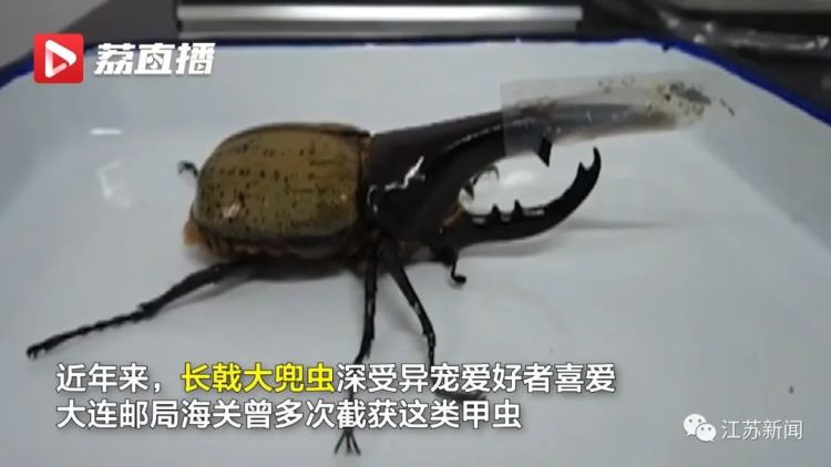 “甲虫外壳呈深褐色,有金属光泽,触角上有一个塑料保护套,但是因为它的整体状态比较活跃,所以它的触角已经有了轻微的破损。经鉴定,这只甲虫就是大连市邮局海关曾经多次截获的长戟大兜虫,也叫大力神甲虫。”大连邮局海关监管科副科长刘淼说。