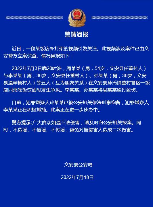 近日,一段某饭店外打架的视频引发关注。此视频涉及案件已由文安警方立案侦查。情况通报如下: