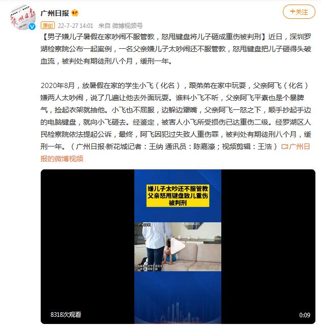 据@广州日报消息,近日,深圳罗湖检察院公布一起案例,一名父亲嫌儿子太吵闹还不服管教,怒甩键盘把儿子砸得头破血流,被判处有期徒刑八个月,缓刑一年。