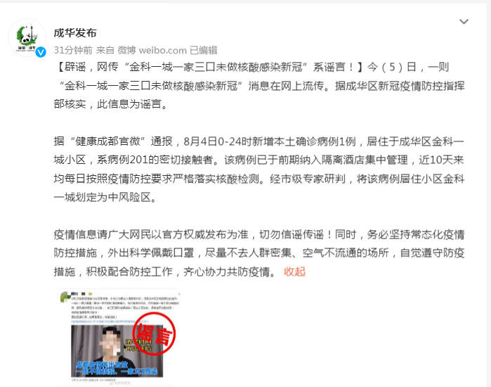 今(5)日,一则“金科一城一家三口未做核酸感染新冠”消息在网上流传。据成华区新冠疫情防控指挥部核实,此信息为谣言。