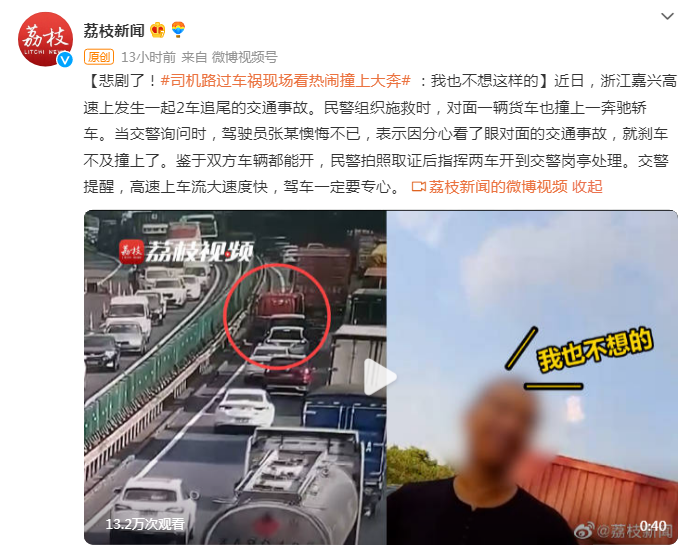 近日,浙江嘉兴高速上发生一起2车追尾的交通事故。民警组织施救时,对面一辆货车也撞上一奔驰轿车。当交警询问时,驾驶员张某懊悔不已,表示因分心看了眼对面的交通事故,就刹车不及撞上了。鉴于双方车辆都能开,民警拍照取证后指挥两车开到交警岗亭处理。交警提醒,高速上车流大速度快,驾车一定要专心。