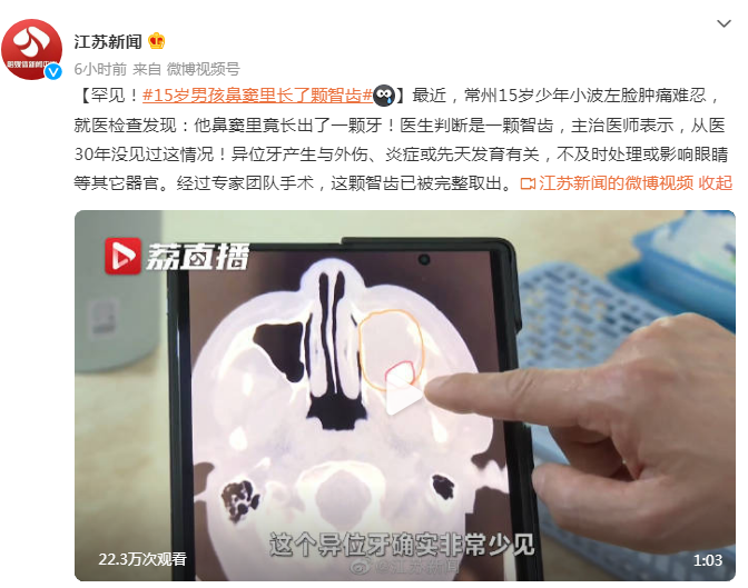 最近,常州15岁少年小波左脸肿痛难忍,就医检查发现:他鼻窦里竟长出了一颗牙!医生判断是一颗智齿,主治医师表示,从医30年没见过这情况!异位牙产生与外伤、炎症或先天发育有关,不及时处理或影响眼睛等其它器官。经过专家团队手术,这颗智齿已被完整取出。
