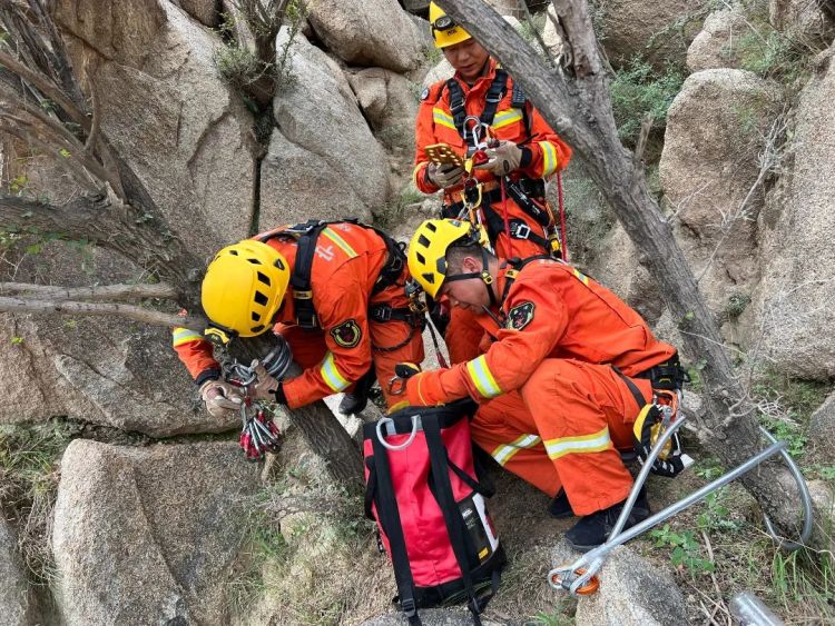 救援人员到达景区后,通过无人机侦察确认了被困人员具体位置,14时34分到达救援地点,经过现场侦察,被困人员处在山体半山腰处,且山体陡峭,坡度较大,增加了救援的难度,救援人员决定通过在山顶架设锚点,从山上迫降至山腰处对被困人员实施救援。