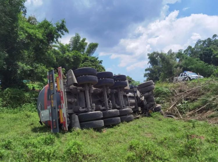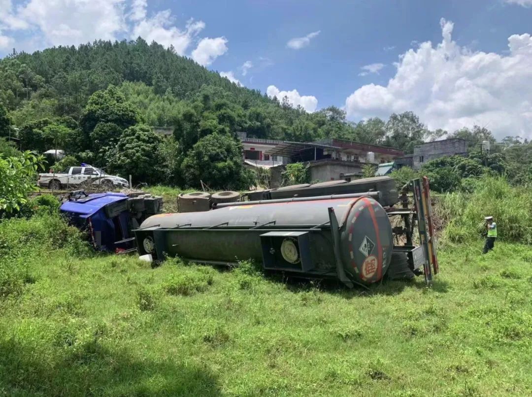 钦州市公安局交警支队三大队民警接警后立即赶赴现场。民警赶到现场后发现,一辆罐式货车翻倒在路边的田里。在确认车内没有危化品后,民警对现场进行临时交通管制,并开展勘察。