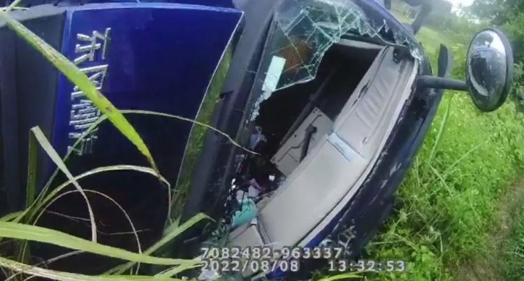 所幸车内两人都系了安全带,事故中没有受伤,之后两人在附近群众的帮助下打破前挡风玻璃后逃生。