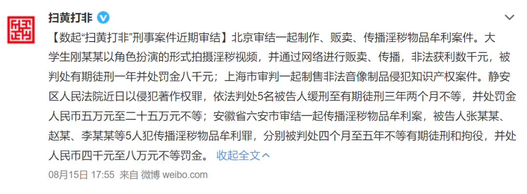 据全国“扫黄打非”办公室消息,数起“扫黄打非”刑事案件近期审结。其中包括北京审结的一起制作、贩卖、传播淫秽物品牟利案件: