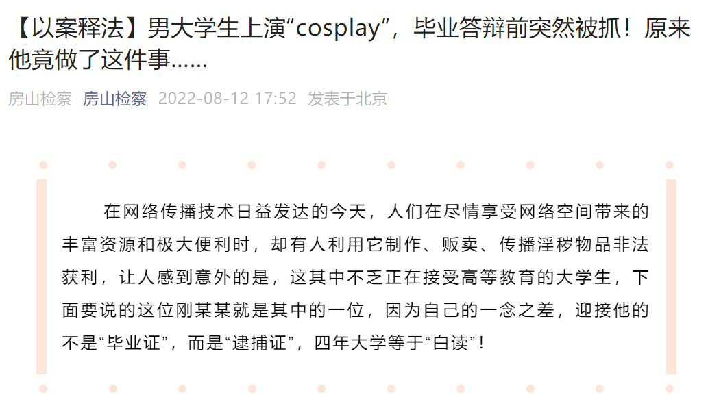 检方介绍,刚某某是北京某大学一名即将毕业的大四学生,在2021年1月至6月间,他多次身着“碎花长裙”“日式高中校服”“洛丽塔”等进行角色扮演,与两名男网友拍摄淫秽视频,并将拍摄的六十余个淫秽视频利用推特、微信、QQ软件等进行贩卖、传播,非法获利数千元。在毕业答辩前夕刚某某因涉嫌制作、贩卖、传播淫秽物品牟利罪被公安机关刑事拘留。