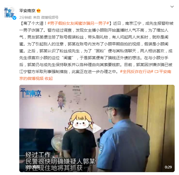 近日,南京江宁,成先生报警称被一男子诈骗了。警方经过调查,发现女主播小顾刚开始直播时人气不高,为了增加人气,男友郭某便注册了账号假装粉丝,带头刷礼物,有人问起两人关系时,就称是闺蜜。为了引起别人的注意,郭某在账号内发布了小顾早期自拍的视频,假装是小顾闺蜜。之后,郭某认识了粉丝成先生,为了“固粉”便与其私信聊天,两人相谈甚欢,成先生很喜欢小顾的这位“闺蜜”,于是郭某便有了骗钱还外债的想法。在与小顾分手后,郭某仍与成先生保持联系并以各种理由向其索要钱款。目前,郭某因涉嫌诈骗已被江宁警方采取刑事强制措施,此案正在进一步办理之中。