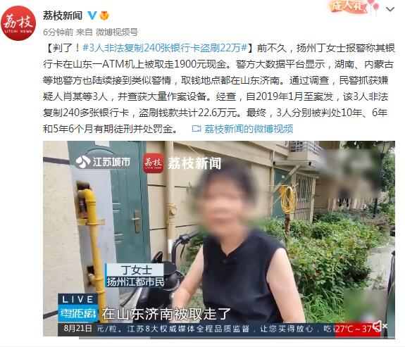 前不久,扬州丁女士报警称其银行卡在山东一ATM机上被取走1900元现金。警方大数据平台显示,湖南、内蒙古等地警方也陆续接到类似警情,取钱地点都在山东济南。通过调查,民警抓获嫌疑人肖某等3人,并查获大量作案设备。经查,自2019年1月至案发,该3人非法复制240多张银行卡,盗刷钱款共计22.6万元。最终,3人分别被判处10年、6年和5年6个月有期徒刑并处罚金。