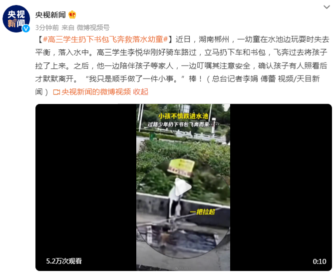 近日,湖南郴州,一幼童在水池边玩耍时失去平衡,落入水中。高三学生李悦华刚好骑车路过,立马扔下车和书包,飞奔过去将孩子拉了上来。之后,他一边陪伴孩子等家人,一边叮嘱其注意安全,确认孩子有人照看后才默默离开。“我只是顺手做了一件小事。”棒!(总台记者李娟 傅蕾)