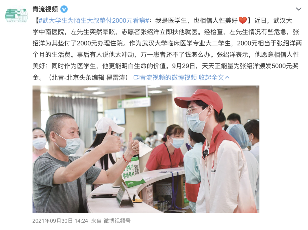 张绍洋是武汉大学2020级临床医学五加三一体化学生,2021年9月,在武汉大学中南医院做志愿者的他,偶遇一位患者突然眩晕。张绍洋将其送到急救中心检查、治疗,甚至还为患者垫付了2000元住院费。 作为医学生的他相信人心自在,“无尽的远方,无数的人们,都与我有关”。