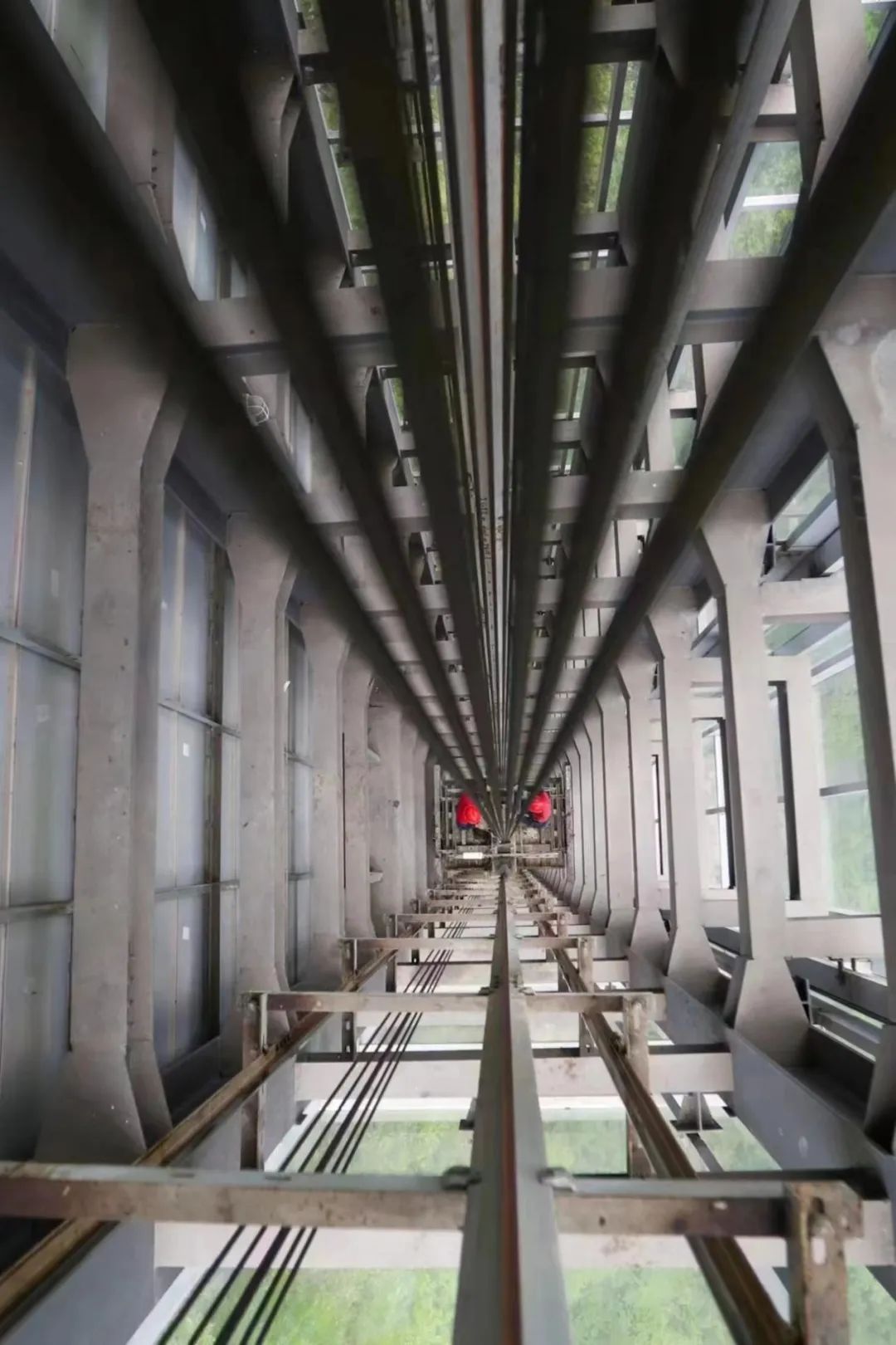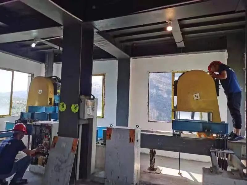 2014年天梯运行,第二年,杜安文和同事们就开始了在悬崖上维修保养电梯的工作。用杜安文的话说,之前维修电梯,高度虽然跟这个差不多,但是在密封的井道里,看不到外面就感觉不到高,而金谷天梯全玻璃结构,直接看到外面,心里不免害怕 。