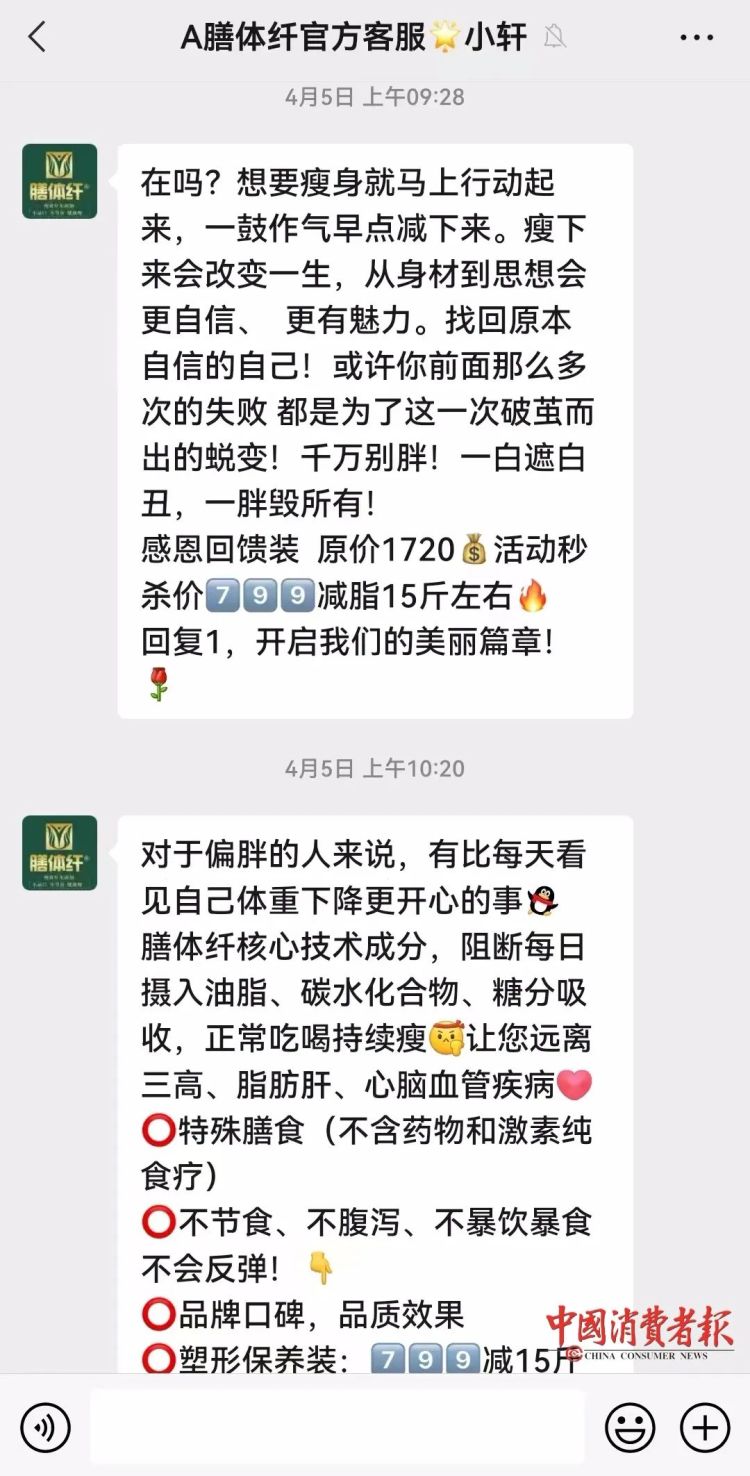 在消费者第一个疗程尚未完成的情况下,“健康管理师”以私人订制名义,极力推荐下一个减肥套餐 ,谎称如果不按计划服用,消费者的身体将会出现严重损伤,同时,以恐吓、威胁方式,控制老年人的心理,诱骗他们购买层层加码的高价产品;
