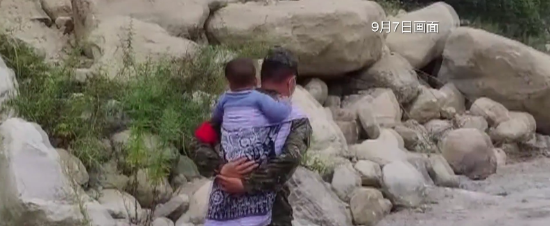 7日下午,武警甘孜支队的官兵们在磨西镇转移群众时,遇到了这对母子。机动一中队排长胥鸿宇主动背着小志豪下山。一路上,小志豪不哭不闹,还淡定地喝着奶。这两天,在志愿者的帮助下,胥鸿宇又和小志豪见面了。