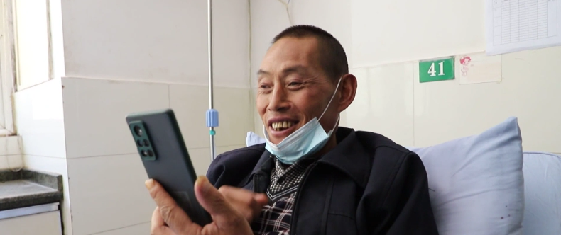 由于任务需要,吴愿没能来到现场,通过手机视频和谢大爷聊天。