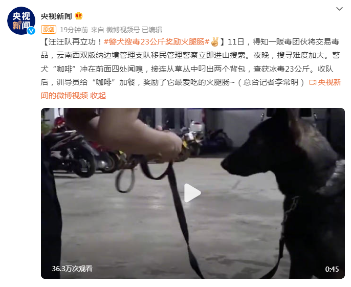 11日,得知一贩毒团伙将交易毒品,云南西双版纳边境管理支队移民管理警察立即进山搜索。夜晚,搜寻难度加大。警犬“咖啡”冲在前面四处闻嗅,接连从草丛中叼出两个背包,查获冰毒23公斤。收队后,训导员给“咖啡”加餐,奖励了它最爱吃的火腿肠~(总台记者李常明)