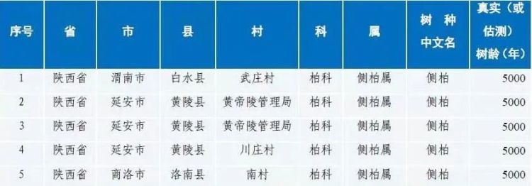 延安市黄陵县黄帝陵的黄帝手植柏、保生柏,以及距离黄陵县城20多公里的老君柏,渭南市白水县仓颉庙内的古柏,商洛市洛南县的页山大古柏。