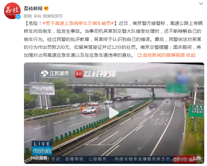 近日,南京警方接警称,高速公路上有辆轿车向后倒车,险些发生事故。当事司机吴某到交警大队接受处理时,还不断辩解自己的倒车行为。经过民警的批评教育,吴某终于认识到自己的错误。最后,民警依法对吴某的行为作出罚款200元、扣留其驾驶证并记12分的处罚。南京交警提醒:国庆期间,将加强对占用高速应急车道以及在应急车道违停的查处。