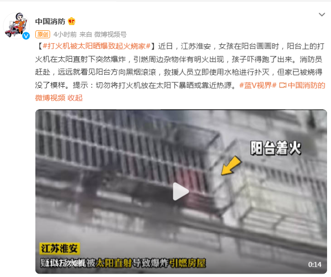 近日,江苏淮安,女孩在阳台画画时,阳台上的打火机在太阳直射下突然爆炸,引燃周边杂物伴有明火出现,孩子吓得跑了出来。消防员赶赴,远远就看见阳台方向黑烟滚滚,救援人员立即使用水枪进行扑灭,但家已被烧得没了模样。提示:切勿将打火机放在太阳下暴晒或靠近热源。