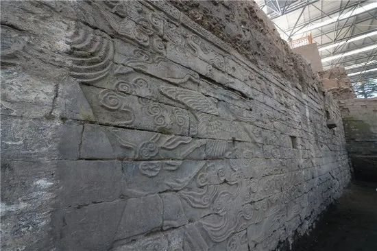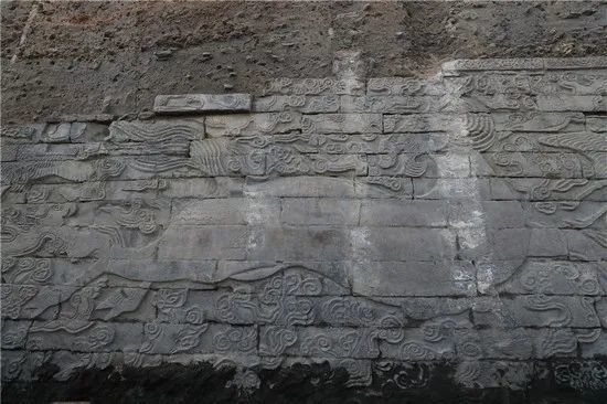 目前揭露的北岸石壁顶部距地表深度约6.8米,石壁通高5.3米,东西长21.2米。整个石壁每组为一匹海马和两只仙鹤环以祥云组成,长度约为7.5米。但推测整个石壁共有4组图案,长度约为30米。