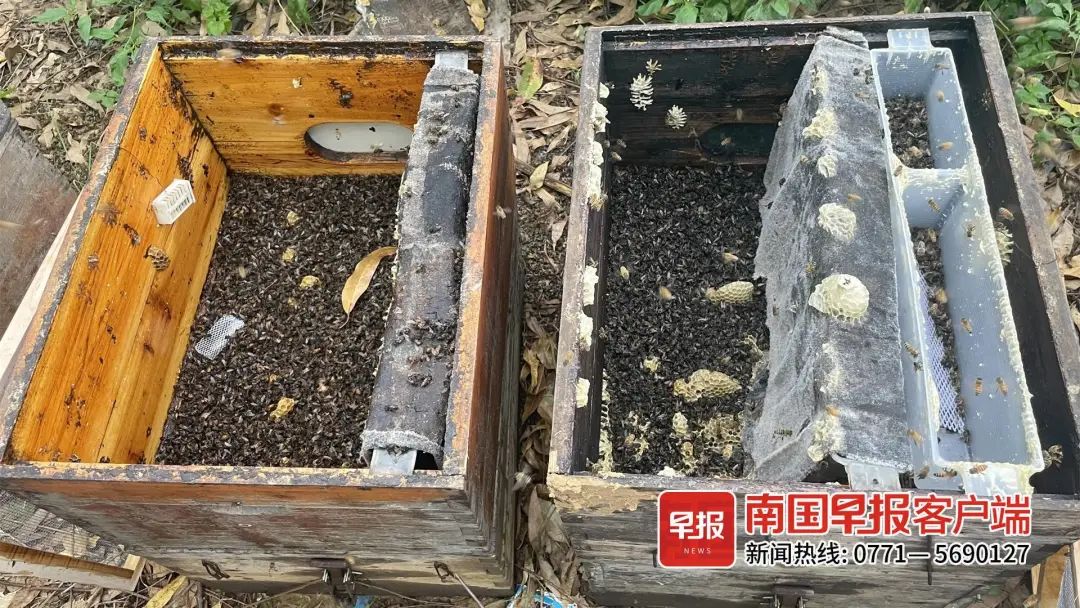 ▲杨先生的蜜蜂在蜂箱内死亡。本文图片均由南国早报记者 罗贝尔摄