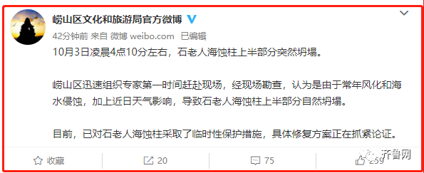 崂山区迅速组织专家第一时间赶赴现场,经现场勘查,认为是由于常年风化和海水侵蚀,加上近日天气影响,导致石老人海蚀柱上半部分自然坍塌。