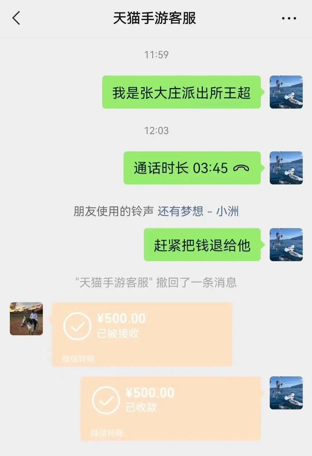 了解情况后,民警使用个人微信添加“天猫手游客服”并对其进行霸气“喊话”。