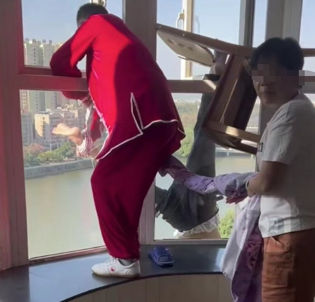 10月25日,广东韶关南雄市发生惊险一幕,一名老人倒挂在14楼窗外,左脚处卡着把椅子摇摇欲坠。在网友拍摄的视频中,有几名路人和邻居冲进了老人的家里,用床单紧紧绑住老人的脚踝,最终救援人员赶到现场帮助老人脱险。