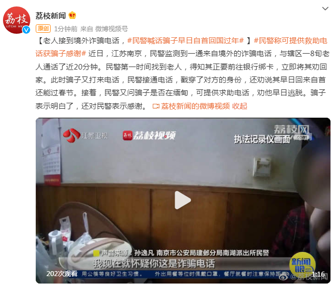 近日,江苏南京,民警监测到一通来自境外的诈骗电话,与辖区一8旬老人通话了近20分钟。民警第一时间找到老人,得知其正要前往银行绑卡,立即将其劝回家。此时骗子又打来电话,民警接通电话,戳穿了对方的身份,还劝说其早日回来自首还能过春节。接着,民警又问骗子是否在缅甸,可提供求助电话,劝他早日逃脱。骗子表示明白了,还对民警表示感谢。