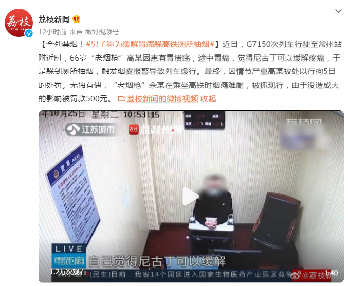 近日,G7150次列车行驶至常州站附近时,66岁“老烟枪”高某因患有胃溃疡,途中胃痛,觉得尼古丁可以缓解疼痛,于是躲到厕所抽烟,触发烟雾报警导致列车缓行。最终,因情节严重高某被处以行拘5日的处罚。无独有偶,“老烟枪”余某在乘坐高铁时烟瘾难耐,被抓现行,由于没造成大的影响被罚款500元。