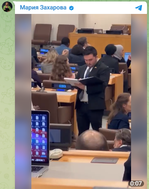 《报纸报》报道称,扎哈罗娃5日在Telegram上发了一段视频,并在配文中介绍称,“联合国大会第三委员会就关于反对将纳粹主义英雄化的决议草案召开会议前,美国代表团一名代表正在检查和记录‘西方集体’盟友中‘被监护人’的出席情况”。