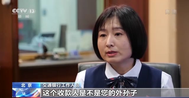交通银行工作人员:我们就询问了一下老人,这个收款人是不是您的外孙子,当时老人前后说的不一致,一开始说是,然后一会又说有点犹豫,但是好像又不太愿意跟我们说实际情况说应该是什么的,这一点也是让我们产生了很大的怀疑。