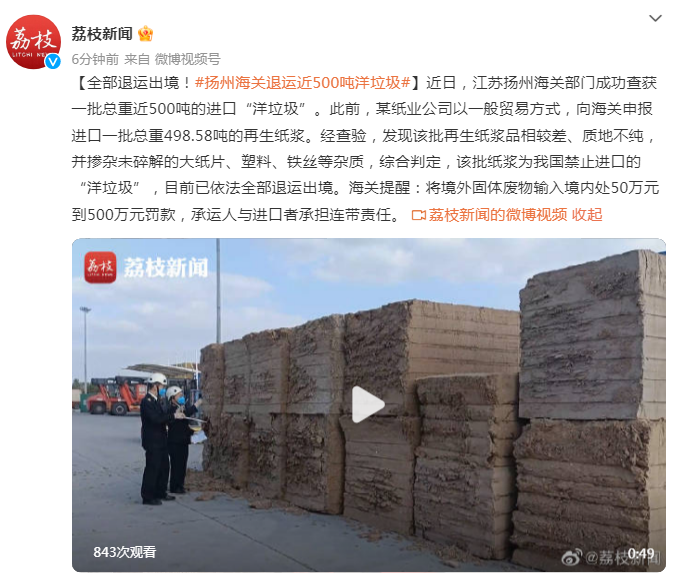 近日,江苏扬州海关部门成功查获一批总重近500吨的进口“洋垃圾”。此前,某纸业公司以一般贸易方式,向海关申报进口一批总重498.58吨的再生纸浆。经查验,发现该批再生纸浆品相较差、质地不纯,并掺杂未碎解的大纸片、塑料、铁丝等杂质,综合判定,该批纸浆为我国禁止进口的“洋垃圾”,目前已依法全部退运出境。海关提醒:将境外固体废物输入境内处50万元到500万元罚款,承运人与进口者承担连带责任。