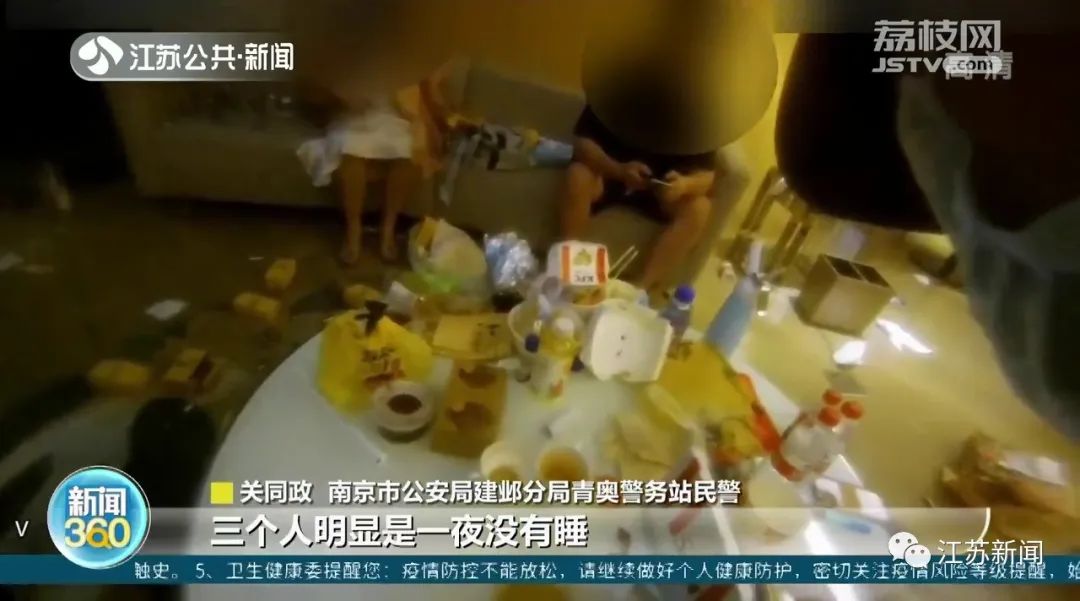 南京市公安局建邺分局青奥警务站民警关同政介绍,当他们进入房间后,看到有三个人躺坐在地上,装有“笑气”的瓶瓶罐罐散落了在地上和沙发上,还有很多食物残渣,“三个人明显一夜没有睡,身上散发酒气。”