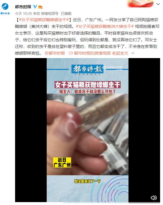 近日,广东广州。一网友分享了自己网购猫粮获赠蟑螂(美洲大蠊)虫干的视频。女子买猫粮获赠美洲大蠊虫干视频拍摄者邓女士表示,这是购买猫粮时出于好奇选择的赠品,平时自家猫咪也很喜欢抓虫子,给它们虫干后它们也特别爱玩,但玩得到处都是,就没再给它们了。邓女士还称,收到的虫干是放在塑料管子里的,而且它都变成冻干了,不会像在家看到蟑螂那样害怕。